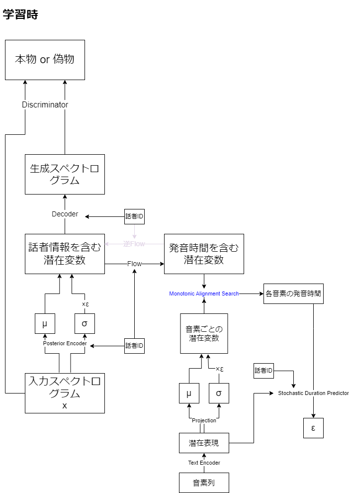 学習時は、Stochastic Duration Predictorの学習のため、各音素の発音時間を予測する必要があります。そのためにMonotonic Alignment Searchと呼ばれる手法を使っています。ここは学習パラメータがないので青文字にしています。